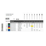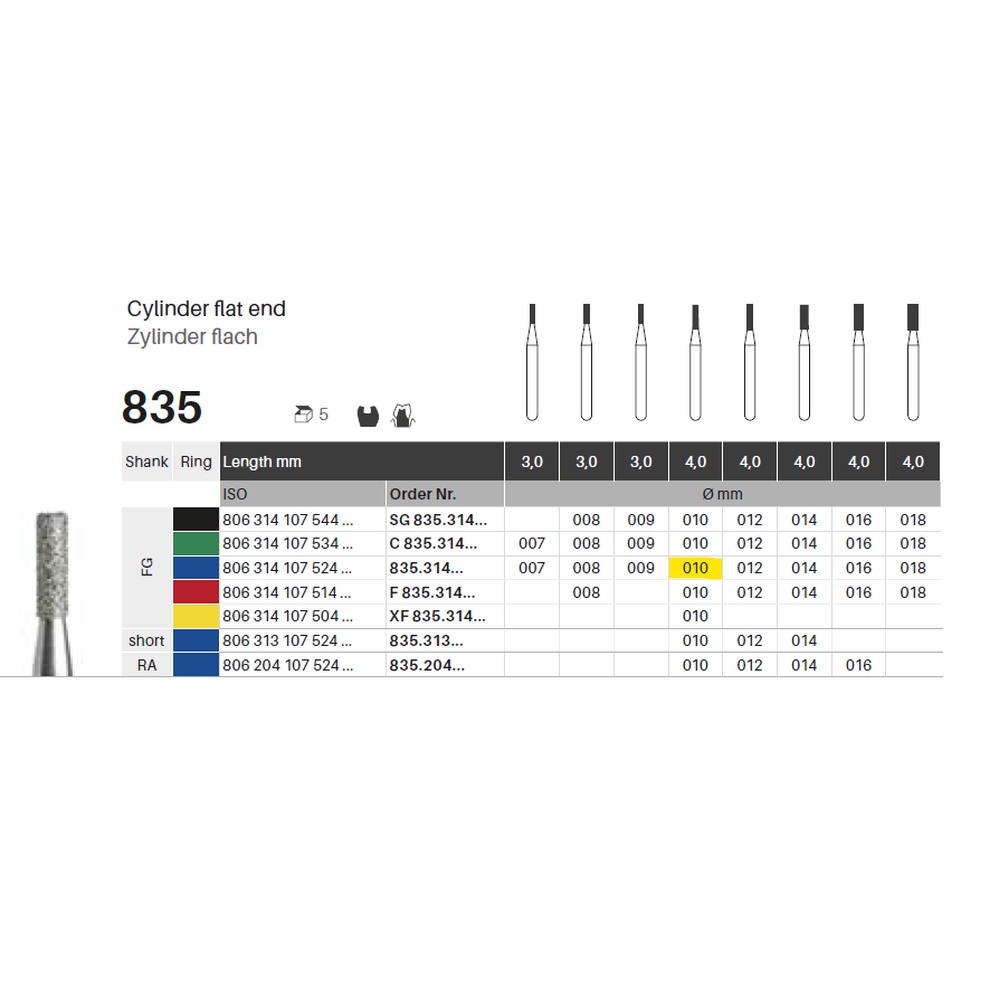Diamantbor med flere diamantlag i den skærende del, så boret er mere holdbart, effektivt og stabilt. Med "Multilayer Diamond Instrument Guarantee" som er producentens garanti for et bor med en god skære-evne over længere tid. Til præparation, til FG, cylinderformet med flad top, medium med blå ring, hovedlængde 4 mm, 108/010 M (835).