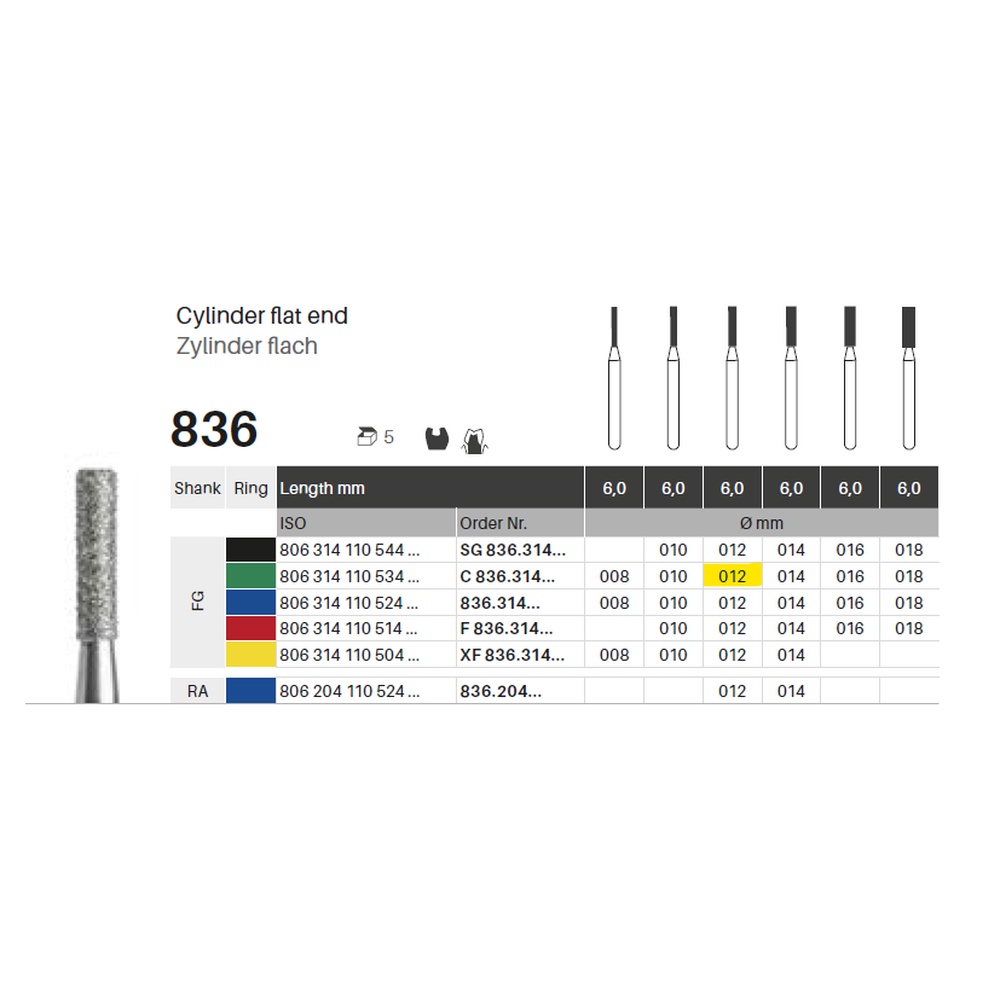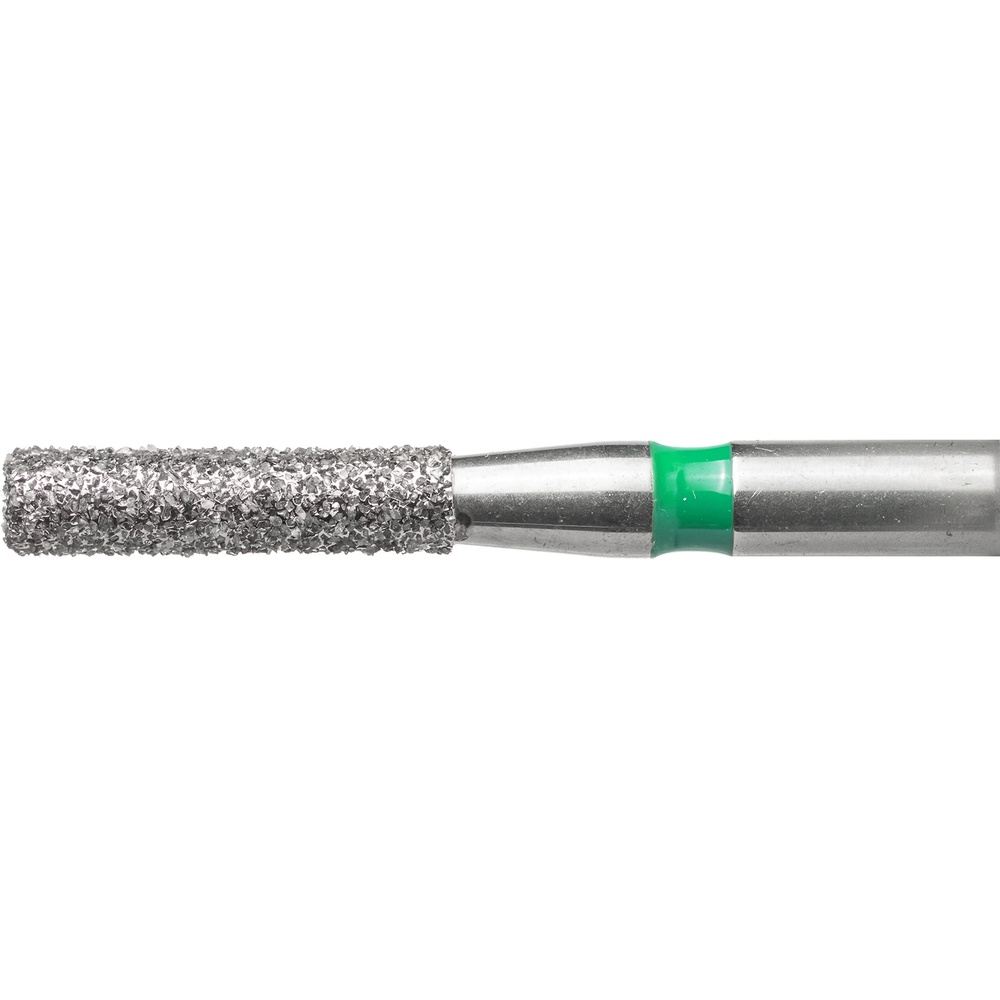 Diamantbor med flere diamantlag i den skærende del, så boret er mere holdbart, effektivt og stabilt. Med "Multilayer Diamond Instrument Guarantee" som er producentens garanti for et bor med en god skære-evne over længere tid. Til præparation, til FG, cylinderformet med flad top, grov med grøn ring, hovedlængde 6 mm, 110/012 C (836).