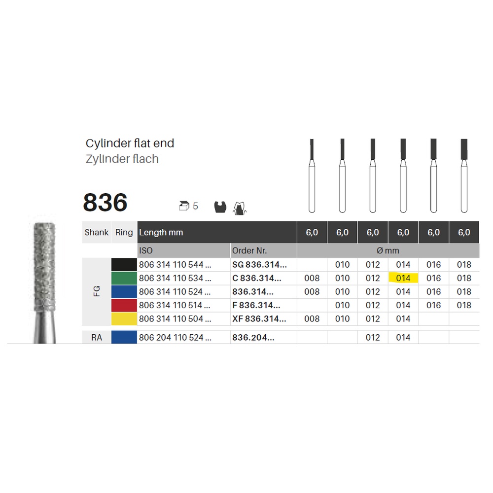 Diamantbor med flere diamantlag i den skærende del, så boret er mere holdbart, effektivt og stabilt. Med "Multilayer Diamond Instrument Guarantee" som er producentens garanti for et bor med en god skære-evne over længere tid. Til præparation, til FG, cylinderformet med flad top, grov med grøn ring, hovedlængde 6 mm, 110/014 C (836).