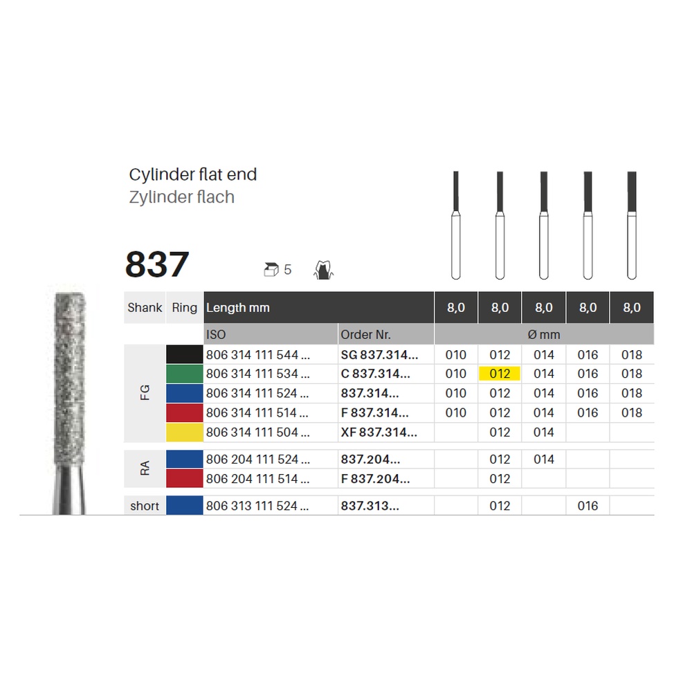 Diamantbor med flere diamantlag i den skærende del, så boret er mere holdbart, effektivt og stabilt. Med "Multilayer Diamond Instrument Guarantee" som er producentens garanti for et bor med en god skære-evne over længere tid. Til præparation, til FG, cylinderformet med flad top, grov med grøn ring, hovedlængde 8 mm, 111/012 C (837).