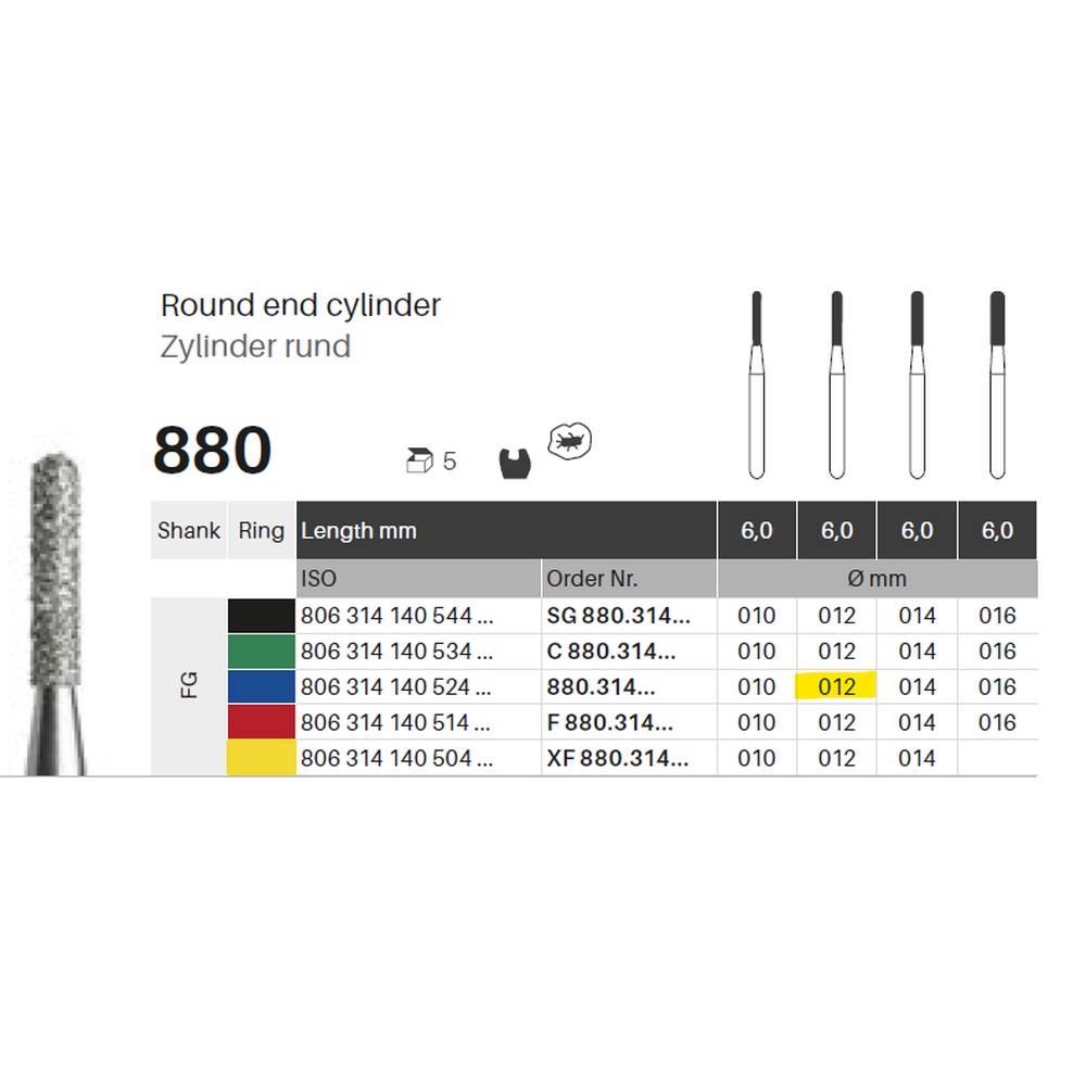 Diamantbor med flere diamantlag i den skærende del, så boret er mere holdbart, effektivt og stabilt. Med "Multilayer Diamond Instrument Guarantee" som er producentens garanti for et bor med en god skære-evne over længere tid. Til præparation, til FG, cylinderformet med rund top, medium med blå ring, hovedlængde 6 mm, 140/012 M (880).