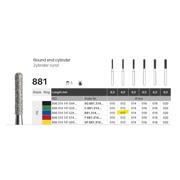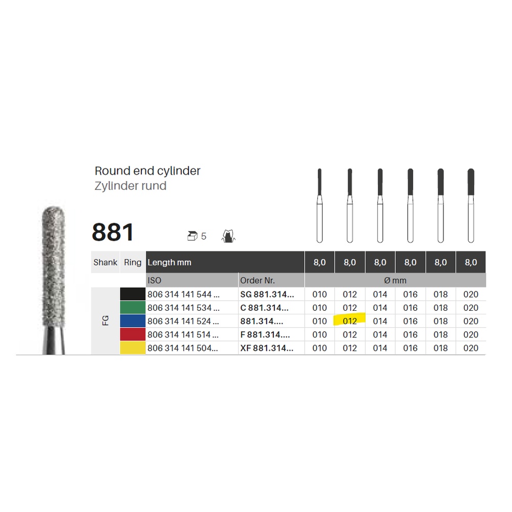 Diamantbor med flere diamantlag i den skærende del, så boret er mere holdbart, effektivt og stabilt. Med "Multilayer Diamond Instrument Guarantee" som er producentens garanti for et bor med en god skære-evne over længere tid. Til præparation, til FG, cylinderformet med rund top, medium med blå ring, hovedlængde 8 mm, 141/012 M (881).