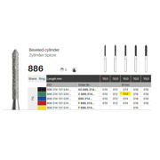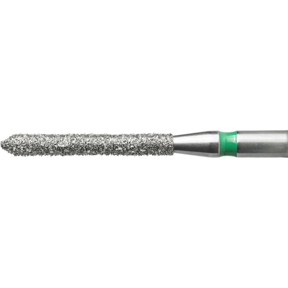 Diamantbor med flere diamantlag i den skærende del, så boret er mere holdbart, effektivt og stabilt. Med "Multilayer Diamond Instrument Guarantee" som er producentens garanti for et bor med en god skære-evne over længere tid. Til præparation, til FG, cylinderformet med spids top, grov med grøn ring, hovedlængde 10 mm, 131/014 C (886).