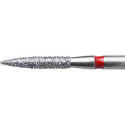 Diamantbor med flere diamantlag i den skærende del, så boret er mere holdbart, effektivt og stabilt. Med "Multilayer Diamond Instrument Guarantee" som er producentens garanti for et bor med en god skære-evne over længere tid. Til pudsning, til FG, flammeformet, fin med rød ring, hovedlængde 8 mm, 249/012 F (862).
