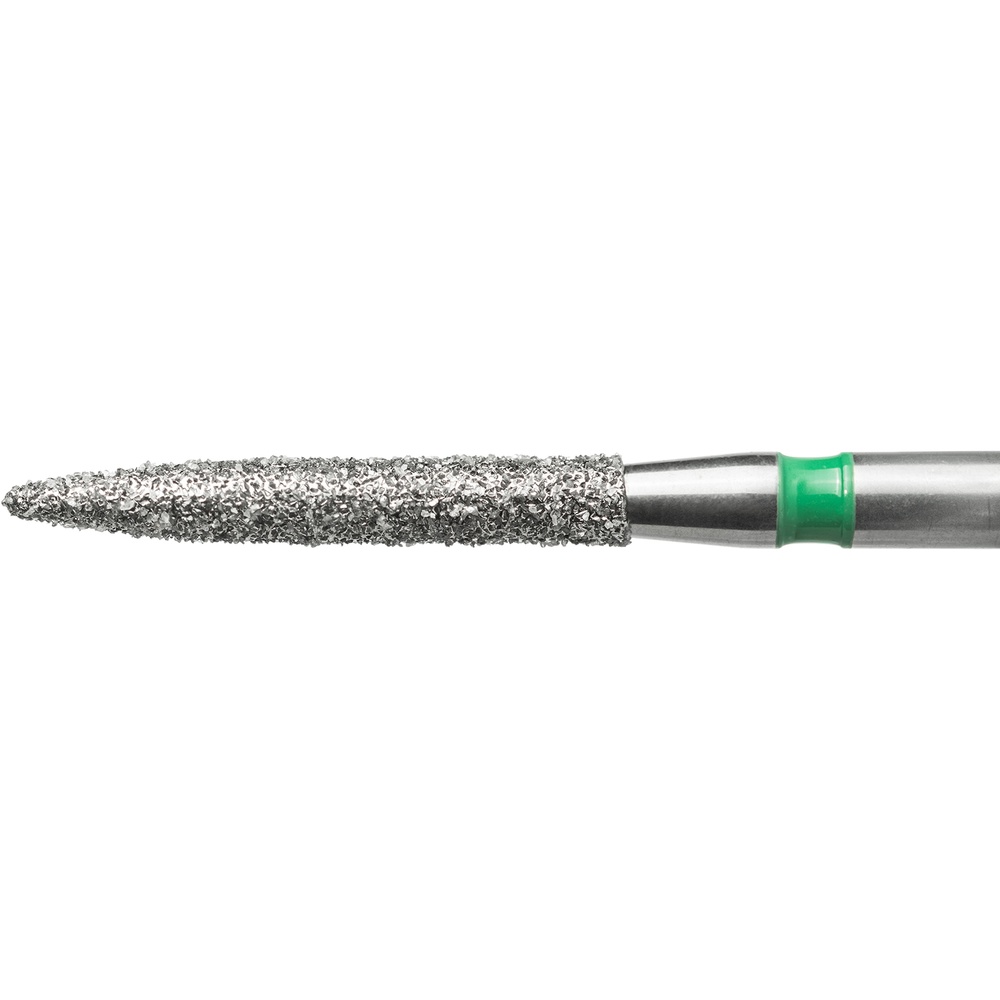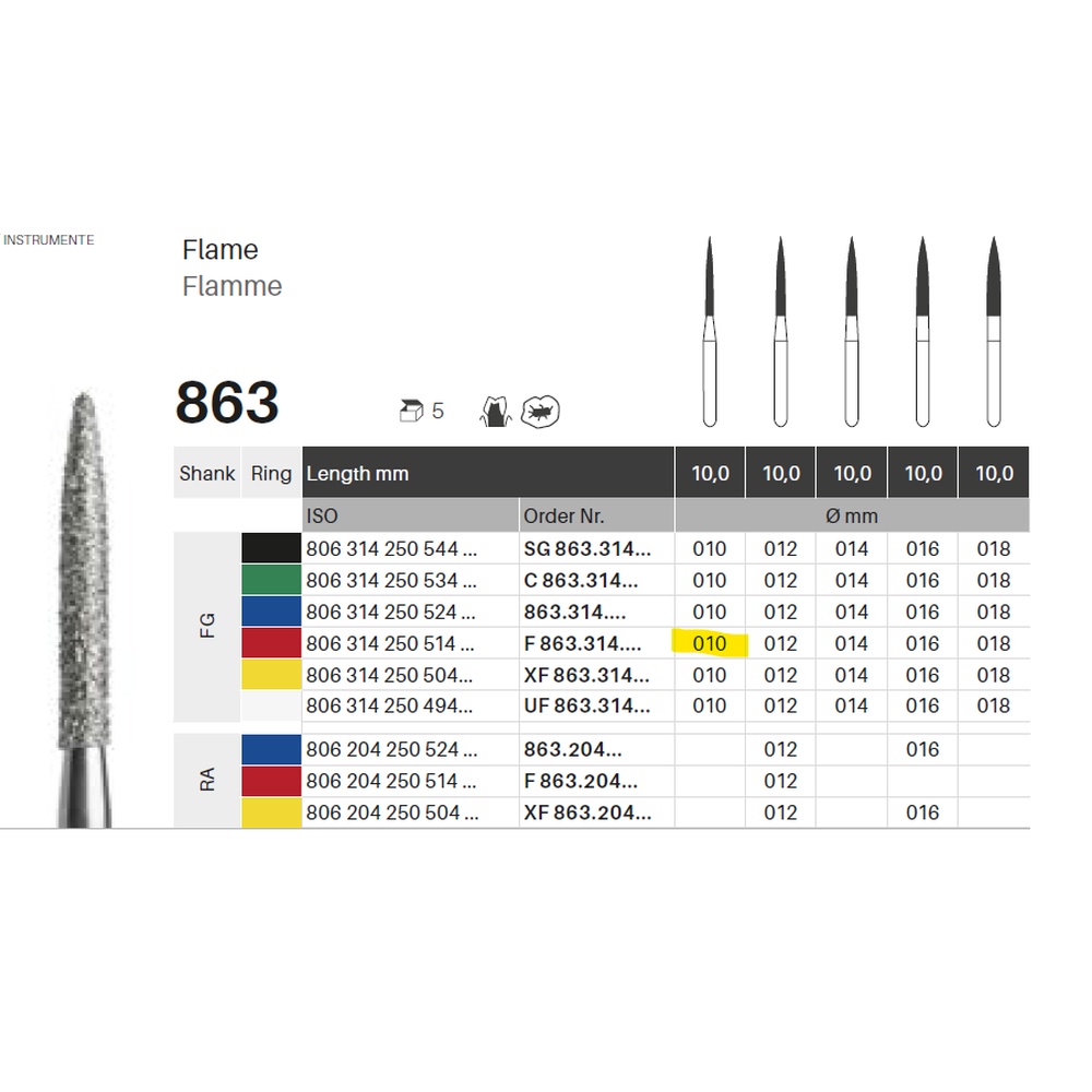 Diamantbor med flere diamantlag i den skærende del, så boret er mere holdbart, effektivt og stabilt. Med "Multilayer Diamond Instrument Guarantee" som er producentens garanti for et bor med en god skære-evne over længere tid. Til pudsning, til FG, flammeformet, fin med rød ring, hovedlængde 10 mm, 250/010 F (863).