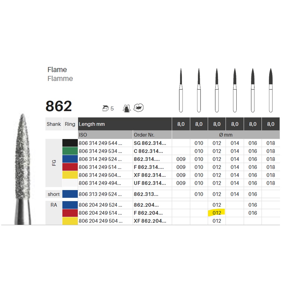 Diamantbor med flere diamantlag i den skærende del, så boret er mere holdbart, effektivt og stabilt. Med "Multilayer Diamond Instrument Guarantee" som er producentens garanti for et bor med en god skære-evne over længere tid. Til pudsning, til RA, flammeformet, fin med rød ring, hovedlængde 8 mm, 249/012 F (862).