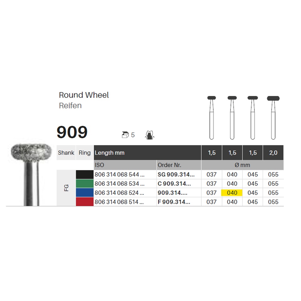 Diamantbor med flere diamantlag i den skærende del, så boret er mere holdbart, effektivt og stabilt. Med "Multilayer Diamond Instrument Guarantee" som er producentens garanti for et bor med en god skære-evne over længere tid. Til præparation, til FG, hjulformet med runde kanter, medium med blå ring, hovedlængde 1,5 mm, 068/040 M (909).