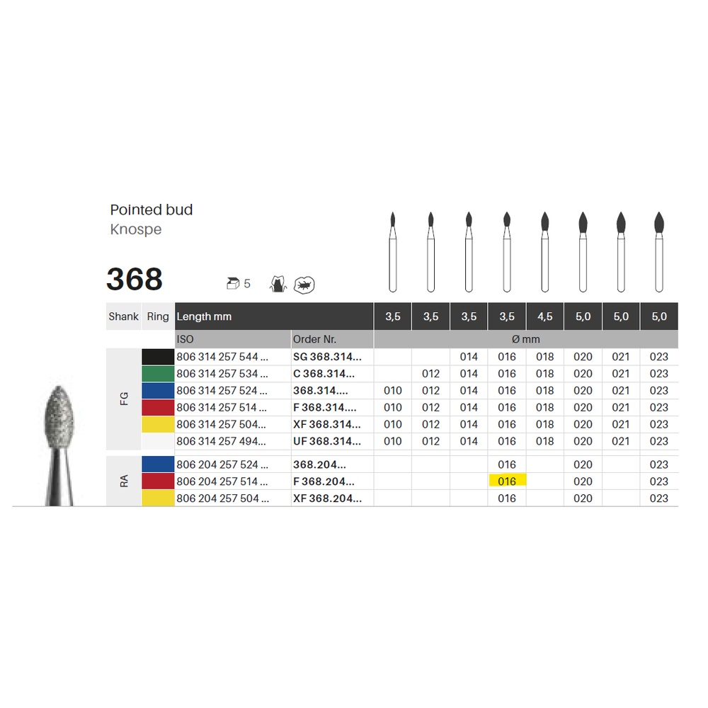 Diamantbor med flere diamantlag i den skærende del, så boret er mere holdbart, effektivt og stabilt. Med "Multilayer Diamond Instrument Guarantee" som er producentens garanti for et bor med en god skære-evne over længere tid. Til pudsning, til RA, knopformet, fin med rød ring, hovedlængde 3,5 mm, 257/016 F (368).