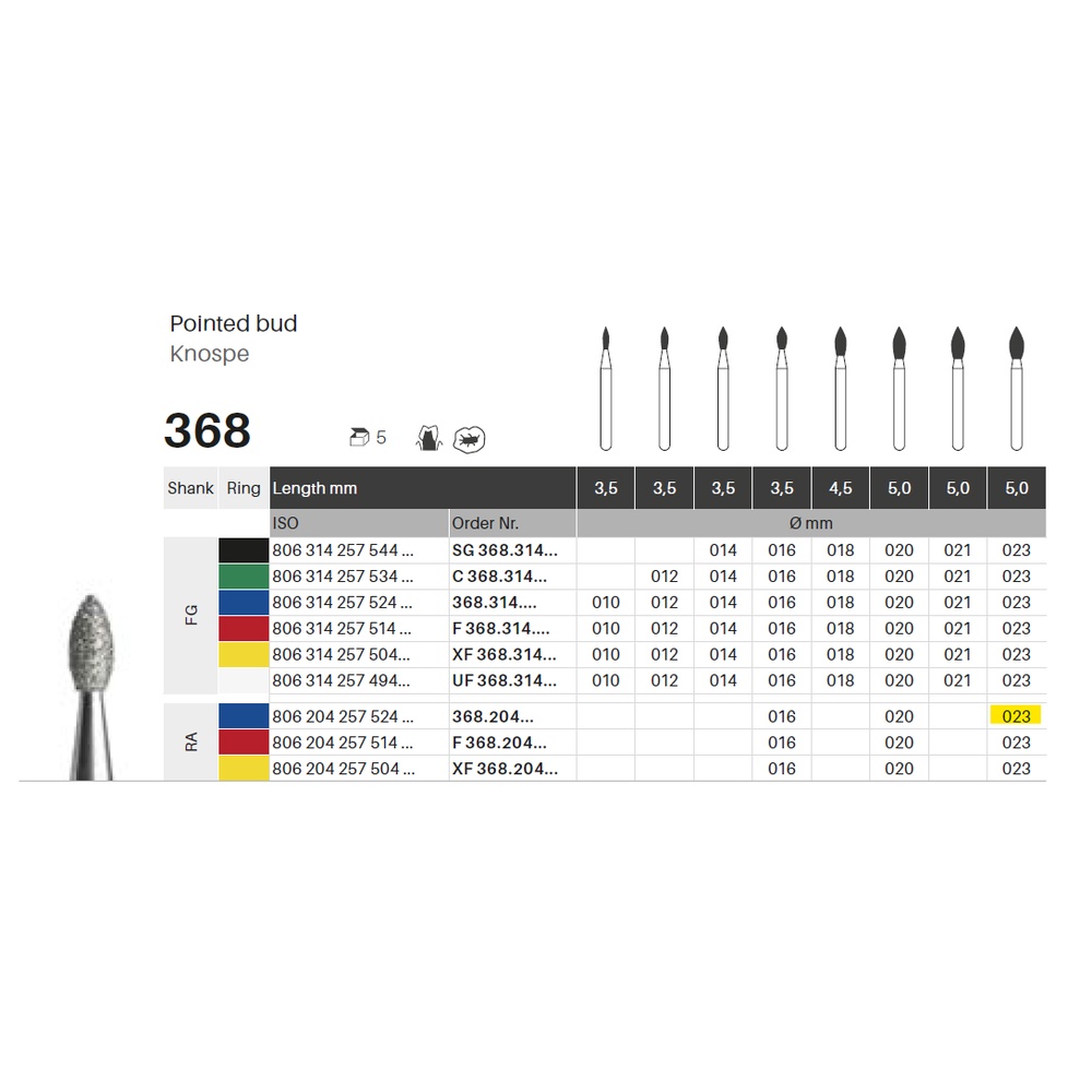 Diamantbor med flere diamantlag i den skærende del, så boret er mere holdbart, effektivt og stabilt. Med "Multilayer Diamond Instrument Guarantee" som er producentens garanti for et bor med en god skære-evne over længere tid. Til præparation, til RA, knopformet, medium med blå ring, hovedlængde 5 mm, 257/023 M (368).
