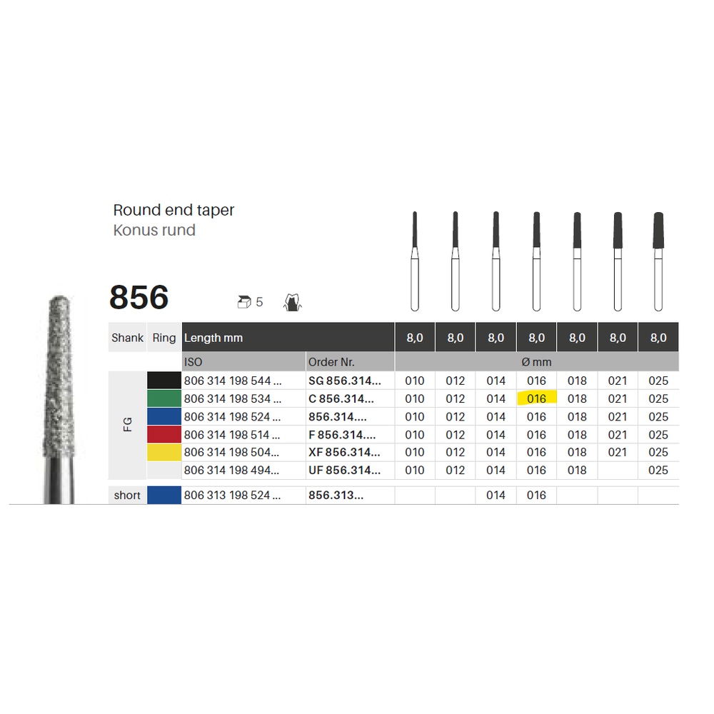 Diamantbor med flere diamantlag i den skærende del, så boret er mere holdbart, effektivt og stabilt. Med "Multilayer Diamond Instrument Guarantee" som er producentens garanti for et bor med en god skære-evne over længere tid. Til præparation, til FG, konisk med afrundet top, grov med grøn ring, hovedlængde 8 mm, 198/016 C (856).