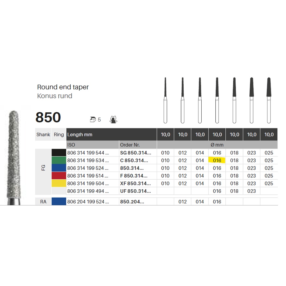 Diamantbor med flere diamantlag i den skærende del, så boret er mere holdbart, effektivt og stabilt. Med "Multilayer Diamond Instrument Guarantee" som er producentens garanti for et bor med en god skære-evne over længere tid. Til præparation, til FG, konisk med afrundet top, grov med grøn ring, hovedlængde 10 mm, 199/016 C (850).