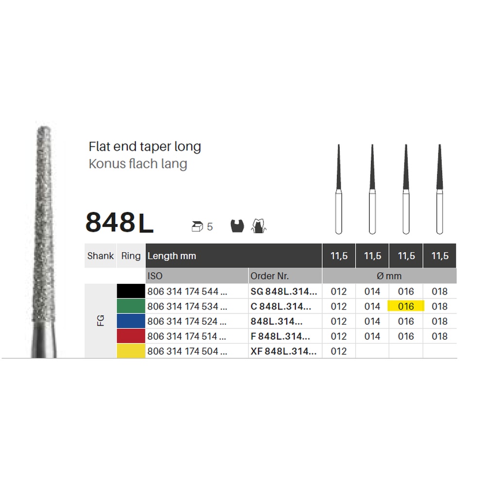 Diamantbor med flere diamantlag i den skærende del, så boret er mere holdbart, effektivt og stabilt. Med "Multilayer Diamond Instrument Guarantee" som er producentens garanti for et bor med en god skære-evne over længere tid. Til præparation, til FG, lang torpedoformet, grov med grøn ring, hovedlængde 11,5 mm, 174/016 C (848L).