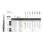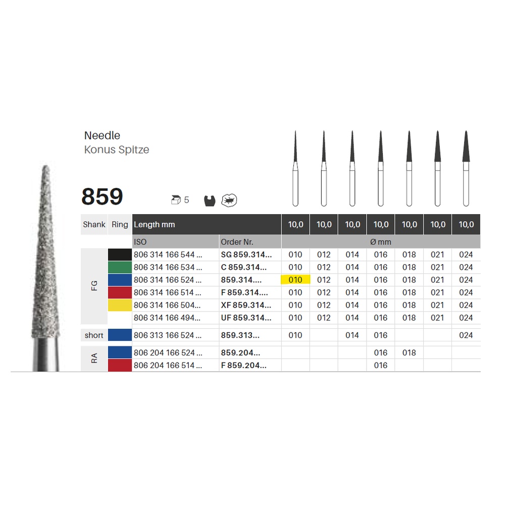 Diamantbor med flere diamantlag i den skærende del, så boret er mere holdbart, effektivt og stabilt. Med "Multilayer Diamond Instrument Guarantee" som er producentens garanti for et bor med en god skære-evne over længere tid. Til præparation, til FG, konisk spids/nåleformet, medium med blå ring, hovedlængde 10 mm, 166/010 M (859).