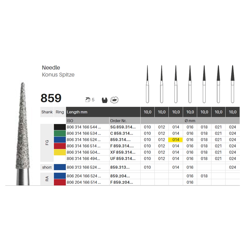 Diamantbor med flere diamantlag i den skærende del, så boret er mere holdbart, effektivt og stabilt. Med "Multilayer Diamond Instrument Guarantee" som er producentens garanti for et bor med en god skære-evne over længere tid. Til præparation, til FG, konisk spids/nåleformet, medium med blå ring, hovedlængde 10 mm, 166/014 M (859).