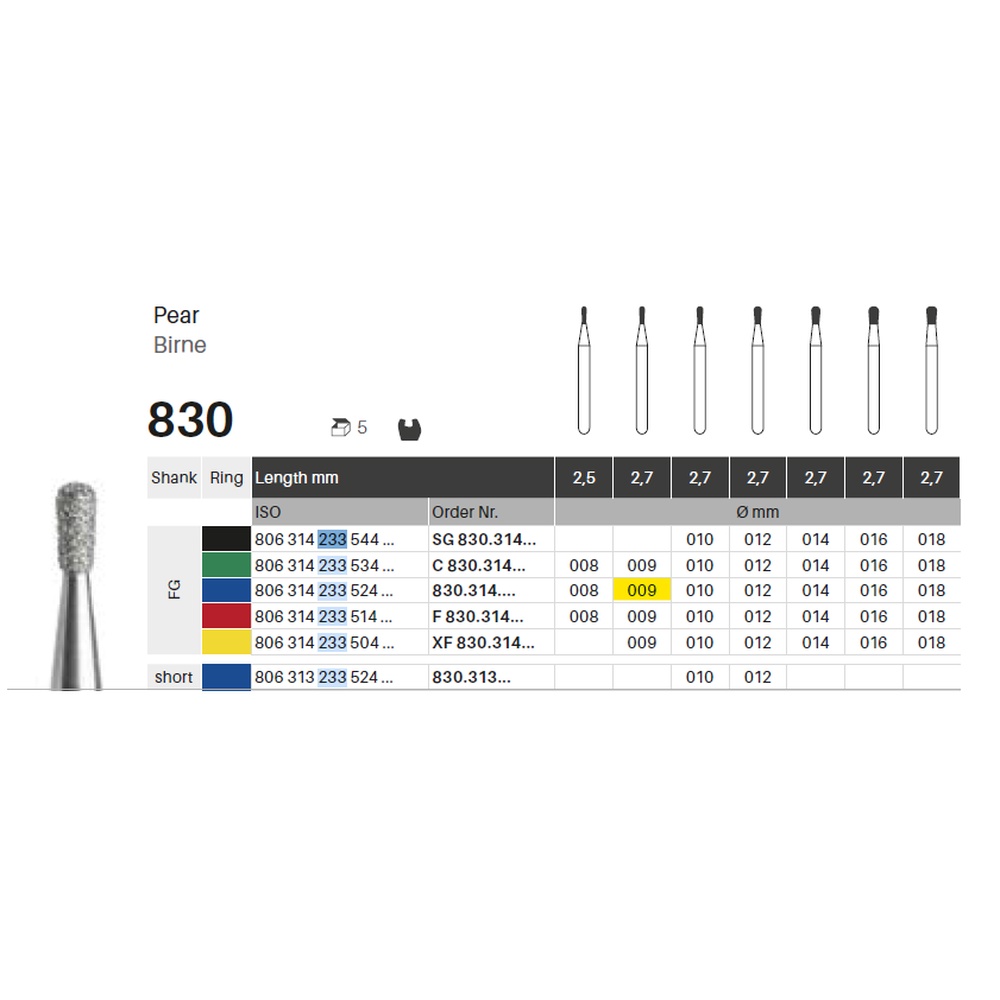 Diamantbor med flere diamantlag i den skærende del, så boret er mere holdbart, effektivt og stabilt. Med "Multilayer Diamond Instrument Guarantee" som er producentens garanti for et bor med en god skære-evne over længere tid. Til præparation, til FG, pæreformet, medium med blå ring, hovedlængde 2,7 mm, 233/009 M (830).