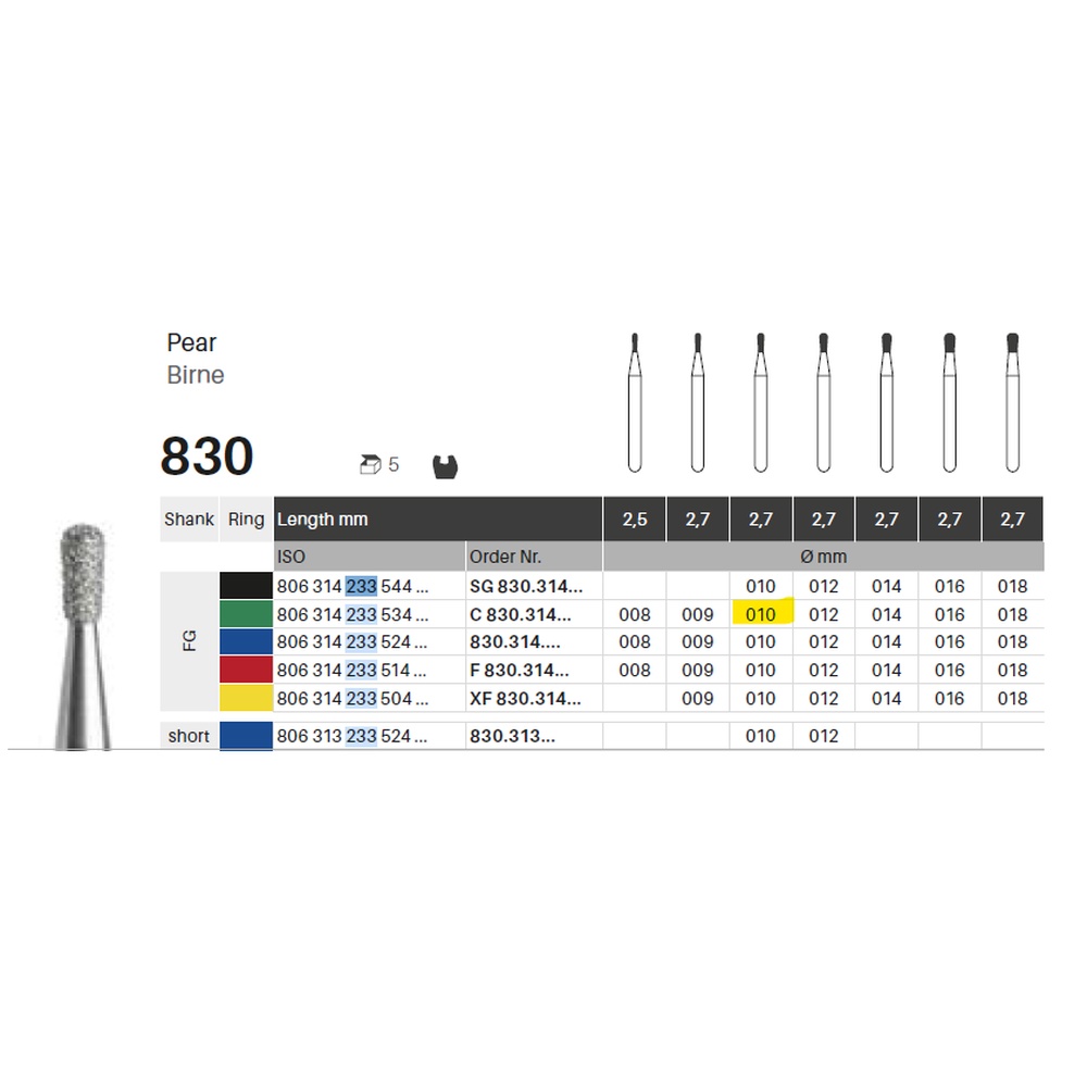 Diamantbor med flere diamantlag i den skærende del, så boret er mere holdbart, effektivt og stabilt. Med "Multilayer Diamond Instrument Guarantee" som er producentens garanti for et bor med en god skære-evne over længere tid. Til præparation, til FG, pæreformet, grov med grøn ring, hovedlængde 2,7 mm, 233/010 C (830).