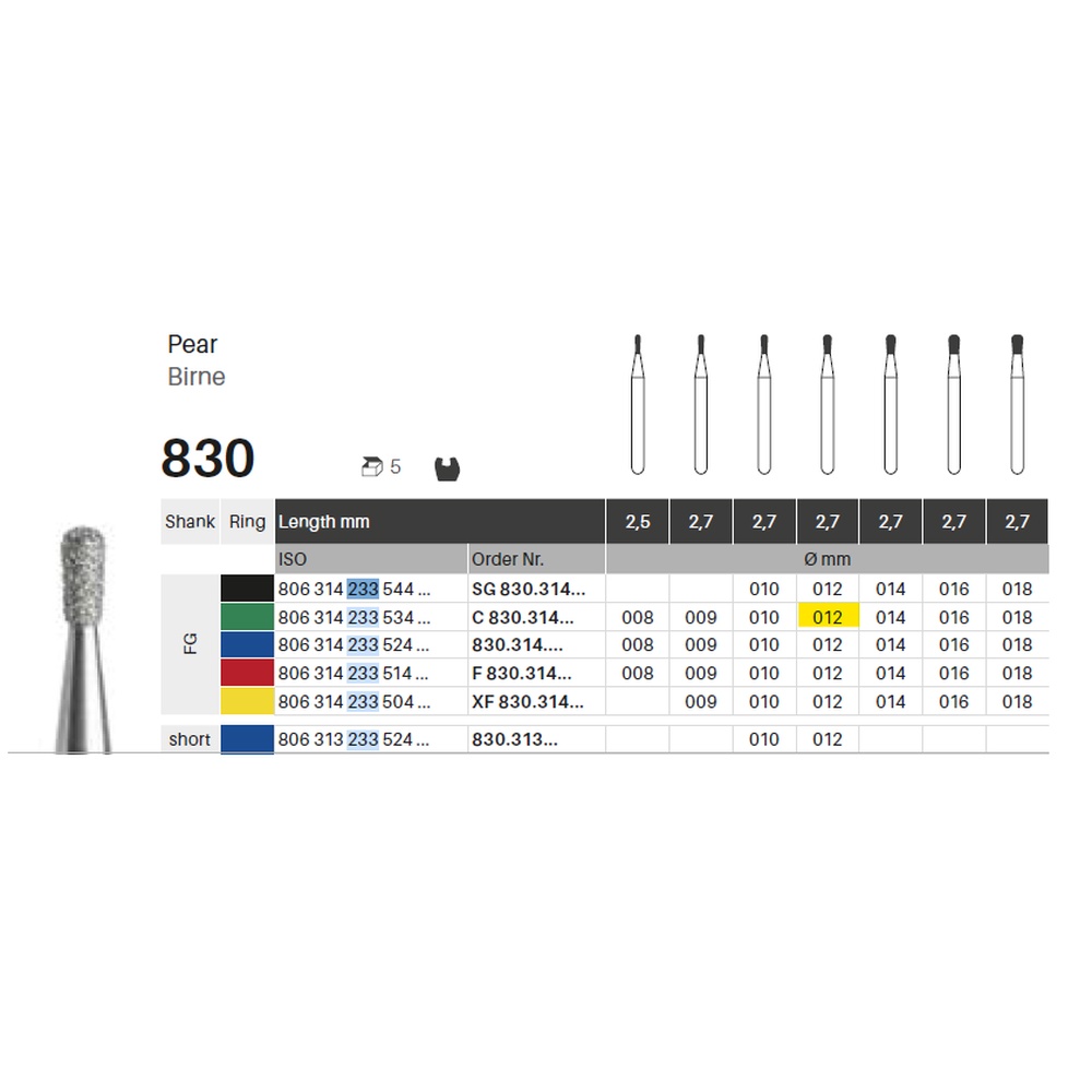 Diamantbor med flere diamantlag i den skærende del, så boret er mere holdbart, effektivt og stabilt. Med "Multilayer Diamond Instrument Guarantee" som er producentens garanti for et bor med en god skære-evne over længere tid. Til præparation, til FG, pæreformet, grov med grøn ring, hovedlængde 2,7 mm, 233/012 C (830).
