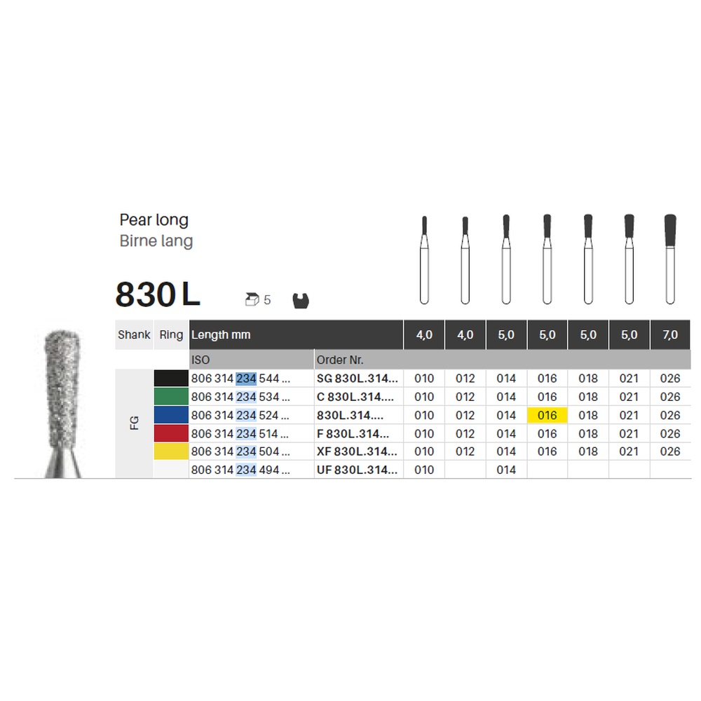 Diamantbor med flere diamantlag i den skærende del, så boret er mere holdbart, effektivt og stabilt. Med "Multilayer Diamond Instrument Guarantee" som er producentens garanti for et bor med en god skære-evne over længere tid. Til præparation, til FG, lang pæreformet, medium med blå ring, hovedlængde 5 mm, 234/016 M (830L).