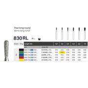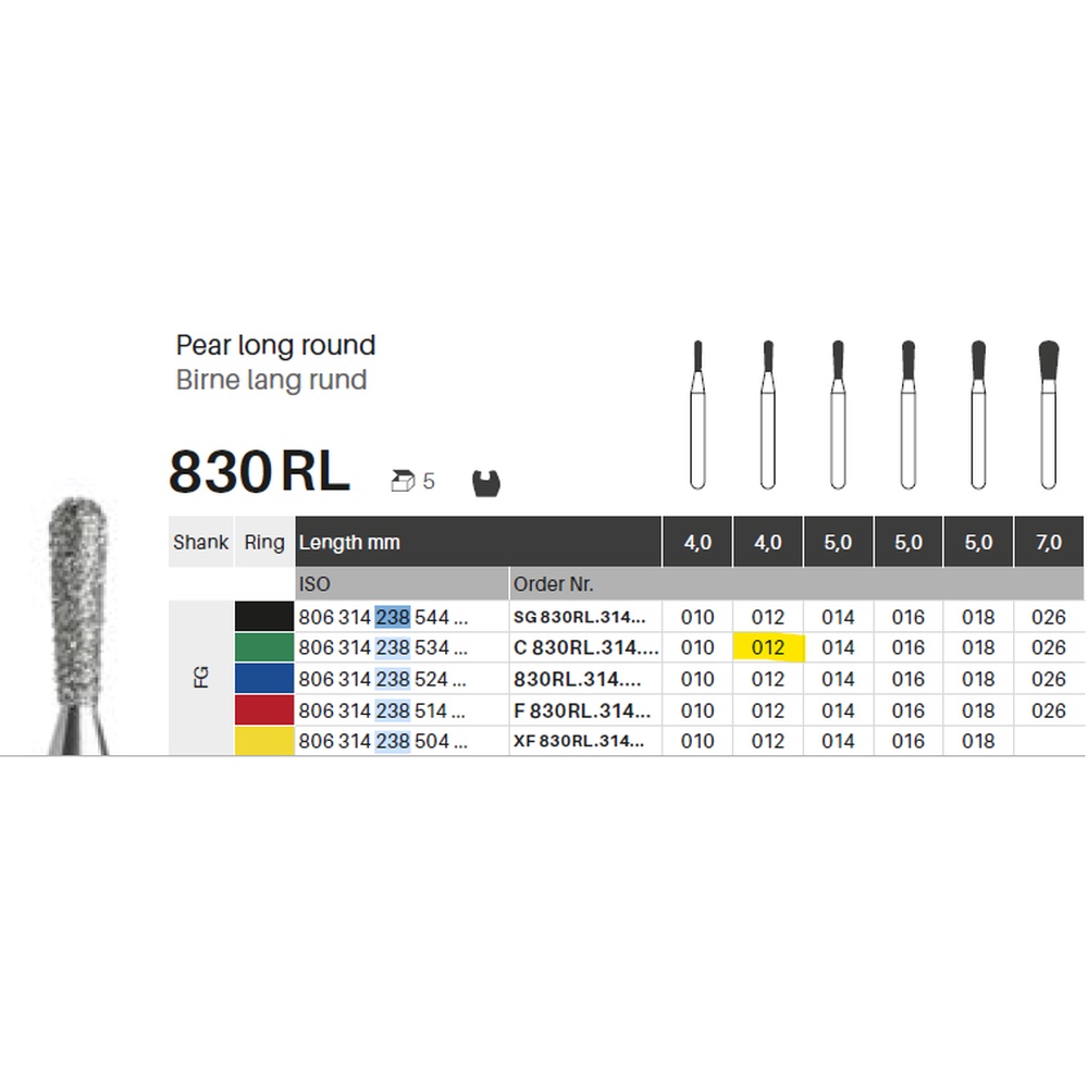 Diamantbor med flere diamantlag i den skærende del, så boret er mere holdbart, effektivt og stabilt. Med "Multilayer Diamond Instrument Guarantee" som er producentens garanti for et bor med en god skære-evne over længere tid. Til præparation, til FG, lang, rund pæreformet, grov med grøn ring, hovedlængde 4 mm, 238/012 C (830RL).