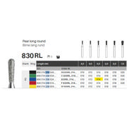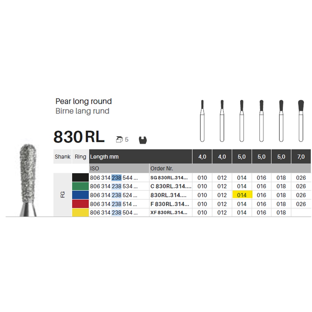 Diamantbor med flere diamantlag i den skærende del, så boret er mere holdbart, effektivt og stabilt. Med "Multilayer Diamond Instrument Guarantee" som er producentens garanti for et bor med en god skære-evne over længere tid. Til præparation, til FG, lang, rund pæreformet, medium med blå ring, hovedlængde 5 mm, 238/014 M (830RL).