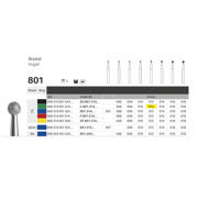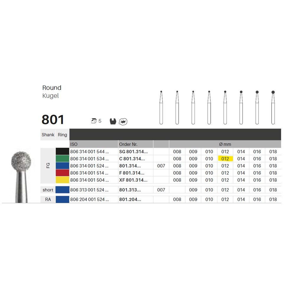 Diamantbor med flere diamantlag i den skærende del, så boret er mere holdbart, effektivt og stabilt. Med "Multilayer Diamond Instrument Guarantee" som er producentens garanti for et bor med en god skære-evne over længere tid. Til præparation, til FG, rund, grov med grøn ring, hovedlængde 1,2 mm, 001/012 C (801).