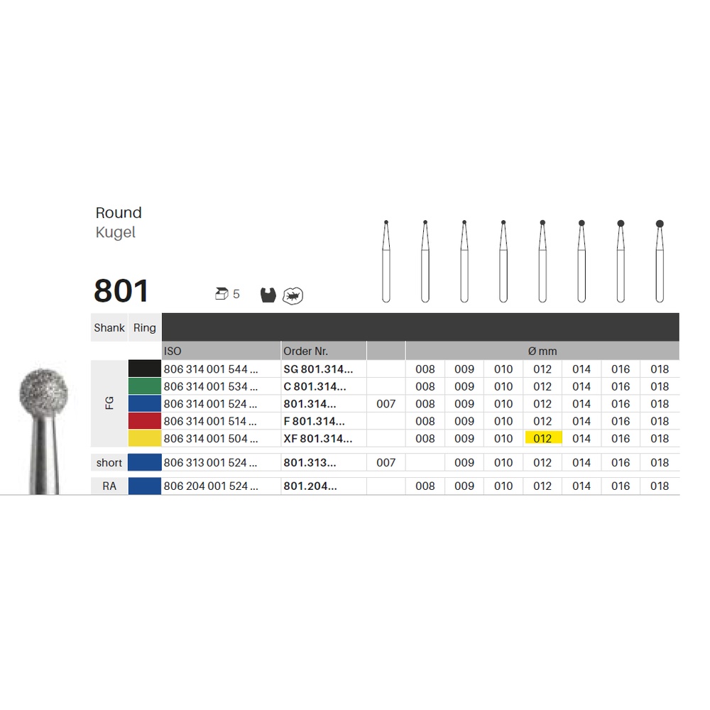 Diamantbor med flere diamantlag i den skærende del, så boret er mere holdbart, effektivt og stabilt. Med "Multilayer Diamond Instrument Guarantee" som er producentens garanti for et bor med en god skære-evne over længere tid. Til pudsning, til FG, rund, ekstra-fin med gul ring, hovedlængde 1,2 mm, 001/012 XF (801).