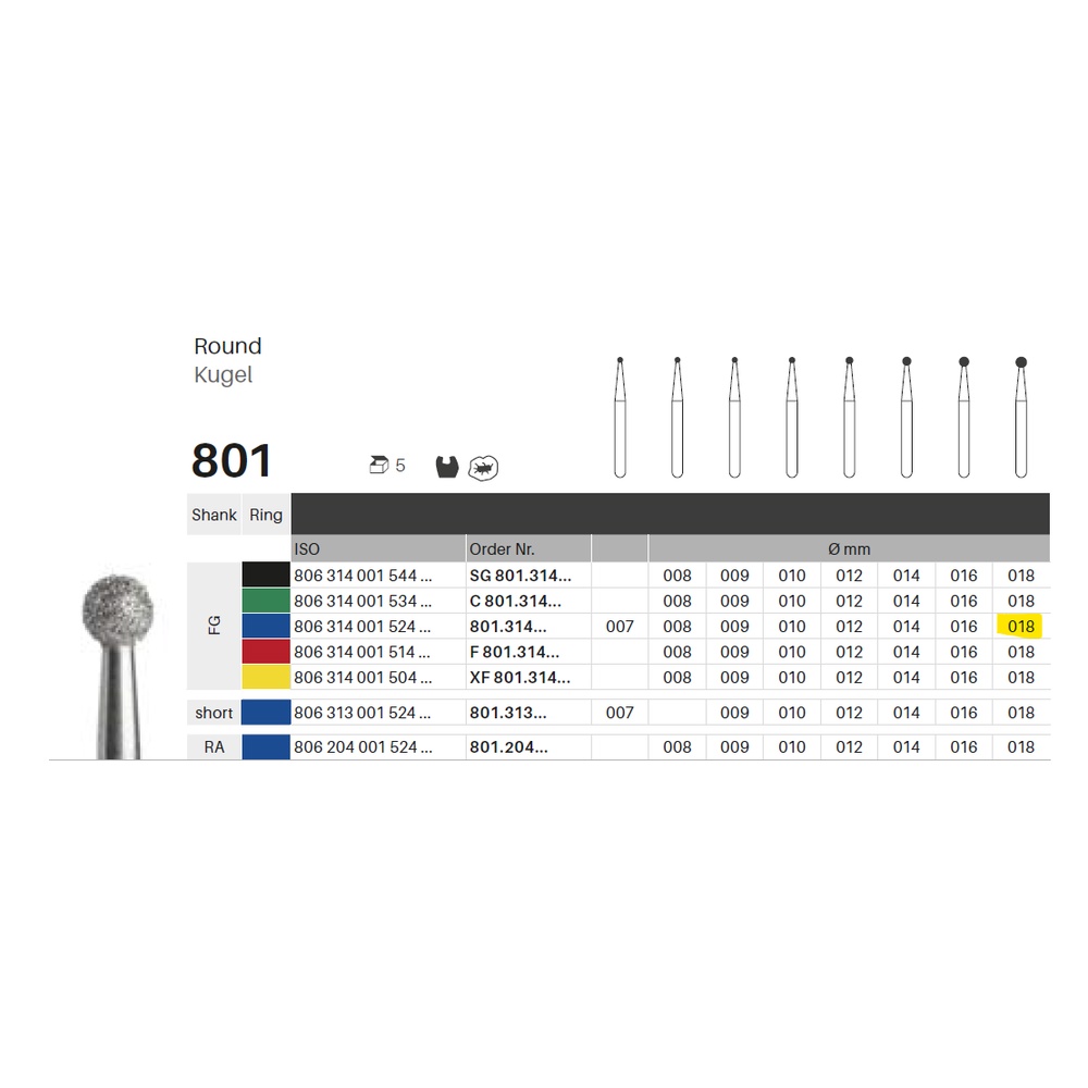 Diamantbor med flere diamantlag i den skærende del, så boret er mere holdbart, effektivt og stabilt. Med "Multilayer Diamond Instrument Guarantee" som er producentens garanti for et bor med en god skære-evne over længere tid. Til præparation, til FG, rund, medium med blå ring, hovedlængde 1,8 mm, 001/018 M (801).