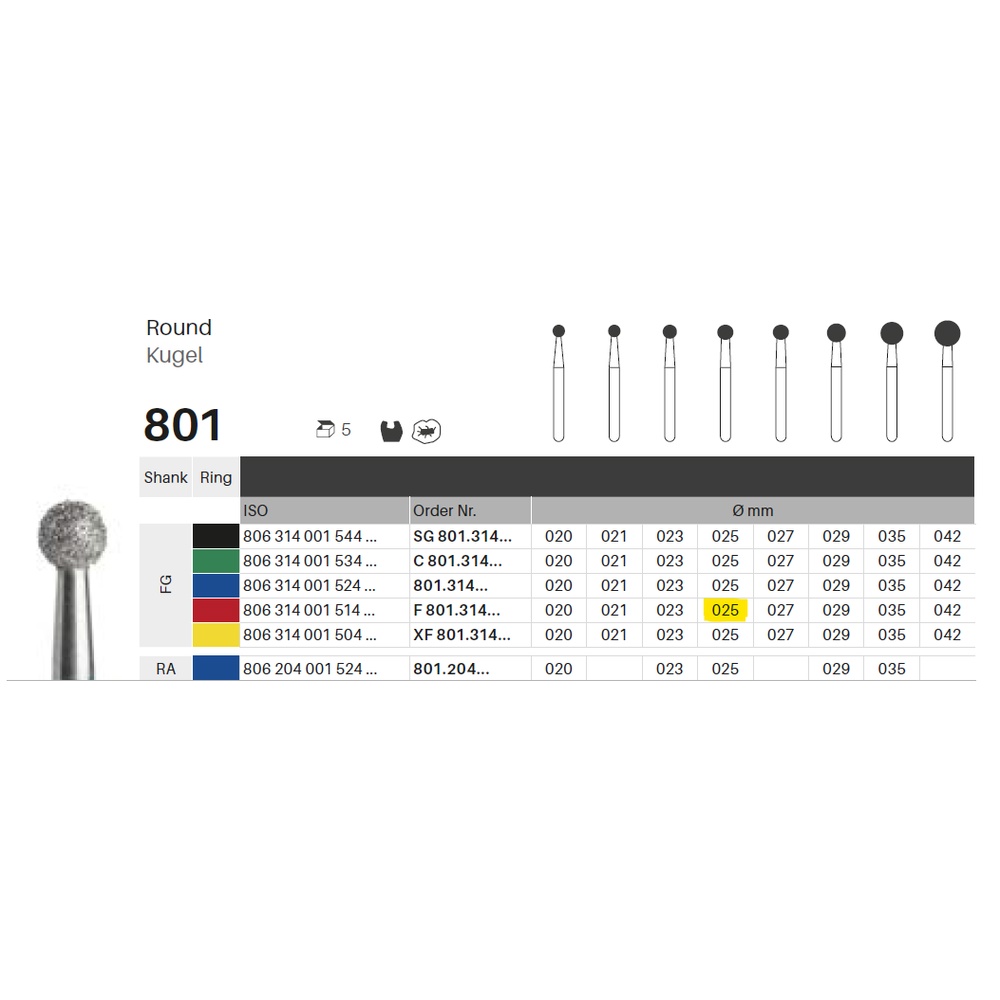 Diamantbor med flere diamantlag i den skærende del, så boret er mere holdbart, effektivt og stabilt. Med "Multilayer Diamond Instrument Guarantee" som er producentens garanti for et bor med en god skære-evne over længere tid. Til pudsning, til FG, rund, fin med rød ring, hovedlængde 2,5 mm, 001/025 F (801).