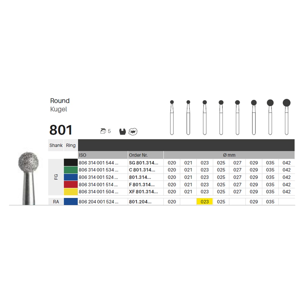 Diamantbor med flere diamantlag i den skærende del, så boret er mere holdbart, effektivt og stabilt. Med "Multilayer Diamond Instrument Guarantee" som er producentens garanti for et bor med en god skære-evne over længere tid. Til præparation, til RA, rund, medium med blå ring, hovedlængde 2,3 mm, 001/023 M (801).