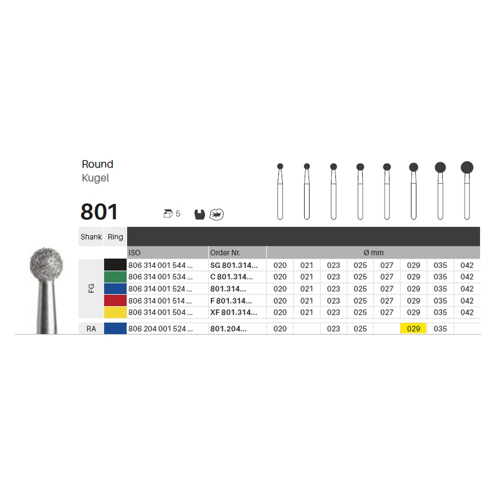 Diamantbor med flere diamantlag i den skærende del, så boret er mere holdbart, effektivt og stabilt. Med "Multilayer Diamond Instrument Guarantee" som er producentens garanti for et bor med en god skære-evne over længere tid. Til præparation, til RA, rund, medium med blå ring, hovedlængde 2,9 mm, 001/029 M (801).
