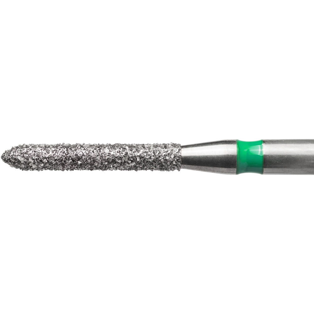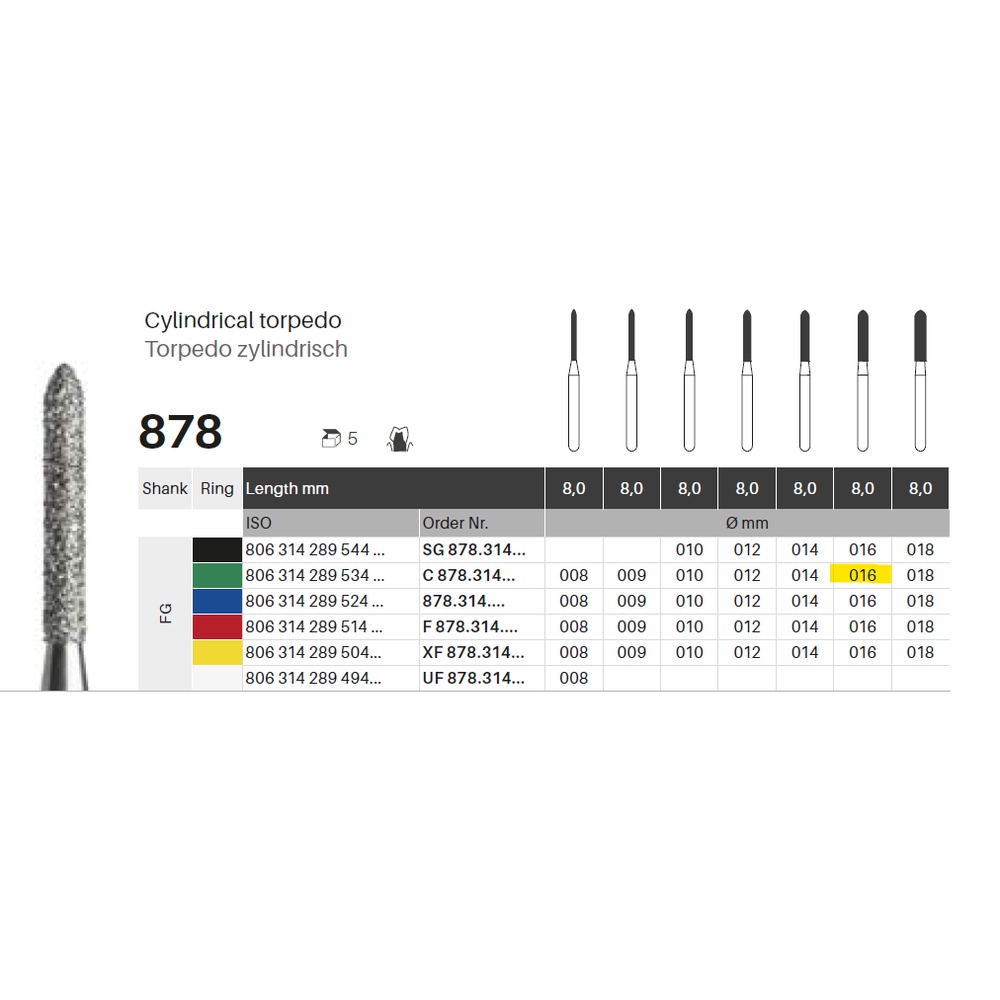 Diamantbor med flere diamantlag i den skærende del, så boret er mere holdbart, effektivt og stabilt. Med "Multilayer Diamond Instrument Guarantee" som er producentens garanti for et bor med en god skære-evne over længere tid. Til præparation, til FG, torpedoformet, grov med grøn ring, hovedlængde 8 mm, 289/016 C (878).