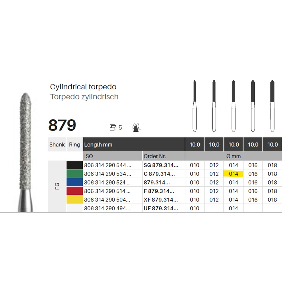Diamantbor med flere diamantlag i den skærende del, så boret er mere holdbart, effektivt og stabilt. Med "Multilayer Diamond Instrument Guarantee" som er producentens garanti for et bor med en god skære-evne over længere tid. Til præparation, til FG, torpedoformet, grov med grøn ring, hovedlængde 10 mm, 290/014 C (879).