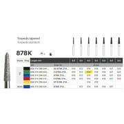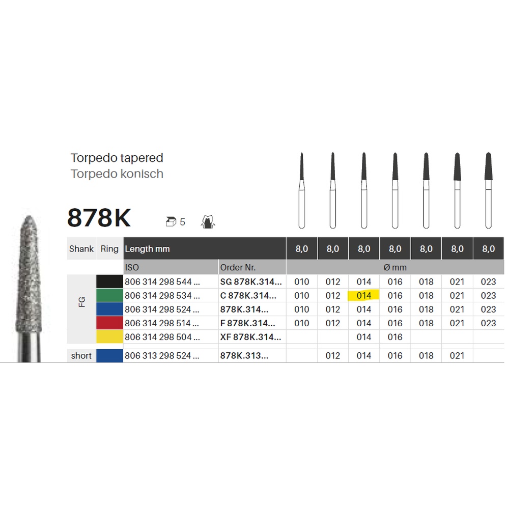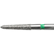 Diamantbor med flere diamantlag i den skærende del, så boret er mere holdbart, effektivt og stabilt. Med "Multilayer Diamond Instrument Guarantee" som er producentens garanti for et bor med en god skære-evne over længere tid. Til præparation, til FG, konisk torpedoformet, grov med grøn ring, hovedlængde 8 mm, 298/014 C (878K).