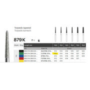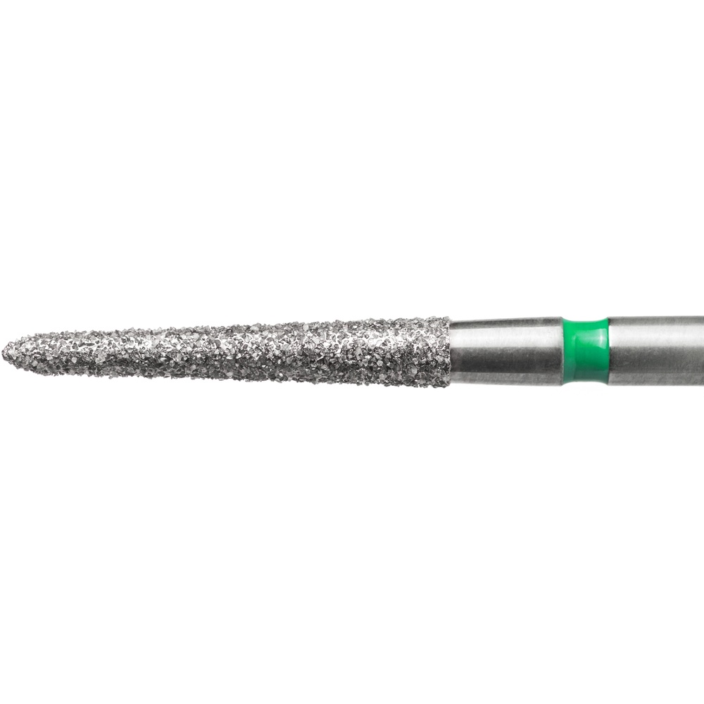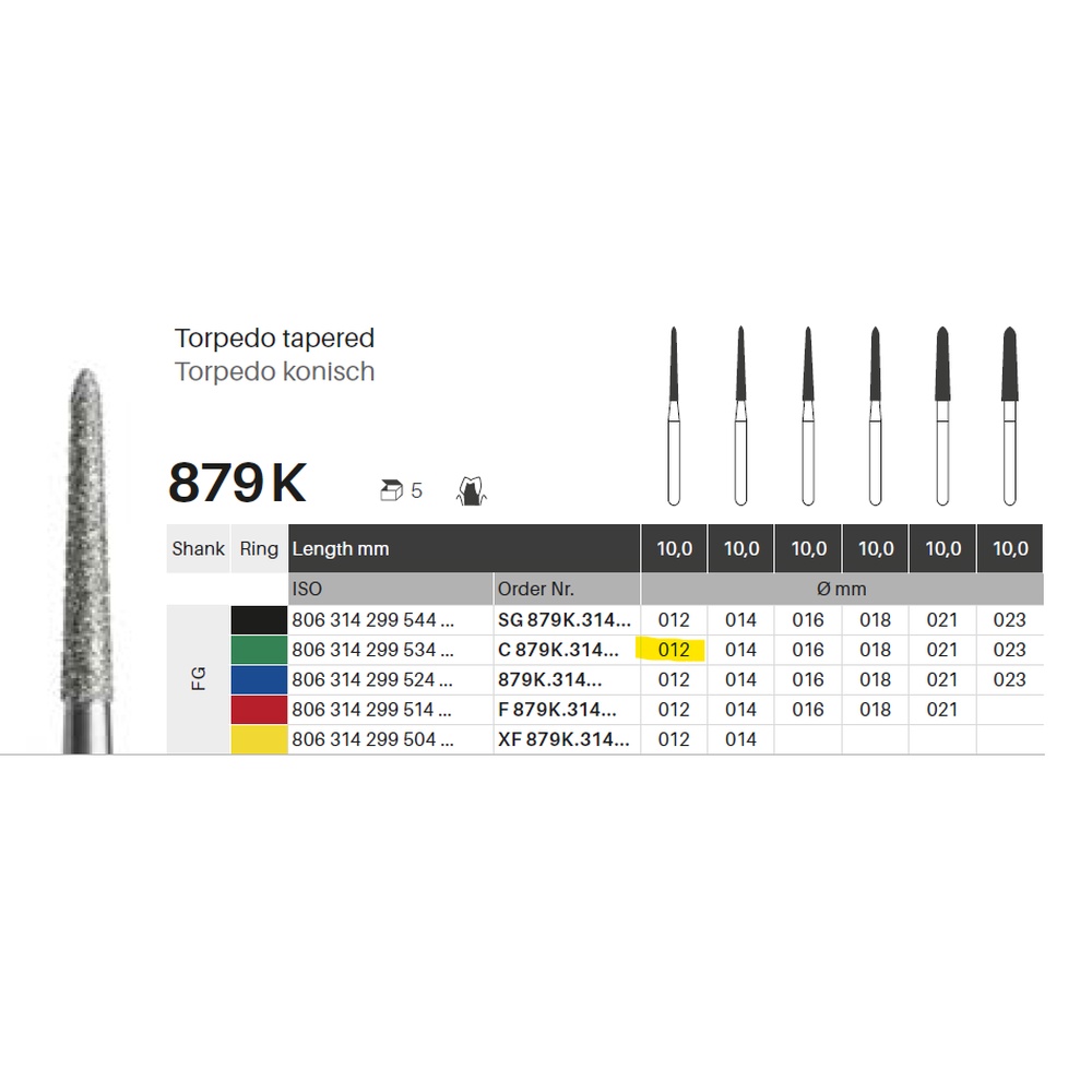 Diamantbor med flere diamantlag i den skærende del, så boret er mere holdbart, effektivt og stabilt. Med "Multilayer Diamond Instrument Guarantee" som er producentens garanti for et bor med en god skære-evne over længere tid. Til præparation, til FG, konisk torpedoformet, grov med grøn ring, hovedlængde 10 mm, 299/012 C (879K).