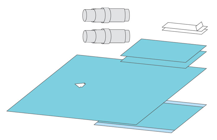 Sæt med 2 afdækningsstykker 45 x 75 cm, 1 hulstykke 150 x 150 cm, 1 bordafdækning 75 x 100 cm, 2 slangeovertræk 8 x 120 cm, 2 OP-tape 9 x 24,5 cm.