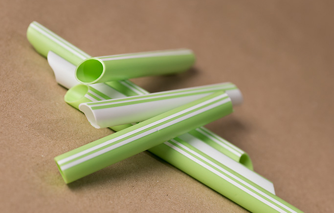 Sug til tykke sugeslanger, i biobaseret polyethylen, hvide med limegrønne striber, 12 cm, skråt afskåret i den ene ende og S-formet i den anden. OBS: kan IKKE autoklaveres.