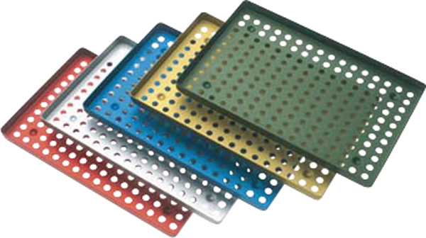 Aluminiumsbakke perforeret uden låg, standard størrelse, 28 x 18 cm. OBS MÅ IKKE ANVENDES I DENTALOPVASKEMASKINER, DA FARVEN PÅVIRKES AF VISSE OPVASKEMIDLER. Blå.