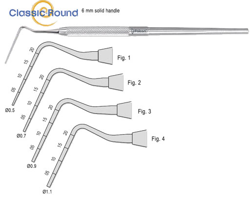 Rustfrit stål instrument 6 mm med riflet greb. Spids bredde 0,9 mm. Markeringer ved 5-10-15-20,