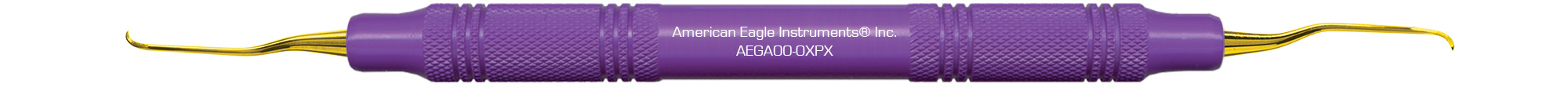 American Eagle Gracey Access 00-0 med guldfarvede ender og lilla plastgreb. OBS: Må ikke slibes. American Eagle Gracey Access er forlænget med 3 mm og med et kortere skær end en Gracey Standard, placeres nemt ved rodoverfladen og giver adgang til snævre parodontale lommer og furkationer. AEGA00-0XPX