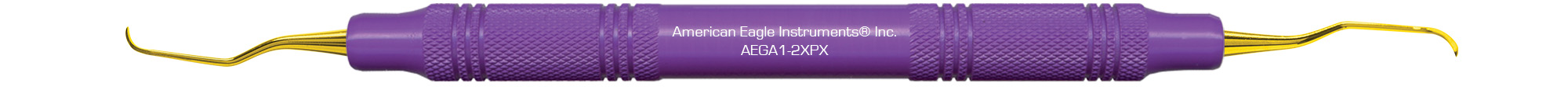 American Eagle Gracey Access 1-2 med guldfarvede ender og lilla plastgreb. OBS: Må ikke slibes. American Eagle Gracey Access er forlænget med 3 mm og med et kortere skær end en Gracey Standard, placeres nemt ved rodoverfladen og giver adgang til snævre parodontale lommer og furkationer. AEGA1-2XPX