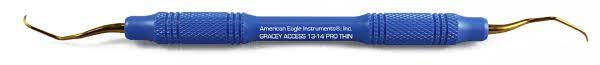 American Eagle Gracey Access 13-14 Pro Thin med guldfarvede ender og blåt plastgreb og tynder skær. OBS: Må ikke slibes. American Eagle Gracey Access er forlænget med 3 mm og med et kortere skær end en Gracey Standard, placeres nemt ved rodoverfladen og giver adgang til snævre parodontale lommer og furkationer. AEGA13-14TXPX