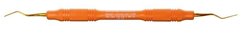 American Eagle Gracey Access 15-16 Pro Thin med guldfarvede ender og orange plastgreb og tynde skær. OBS: Må ikke slibes. American Eagle Gracey Access er forlænget med 3 mm og med et kortere skær end en Gracey Standard, placeres nemt ved rodoverfladen og giver adgang til snævre parodontale lommer og furkationer. AEGA15-16TXPX