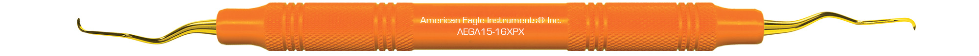 American Eagle Gracey Access 15-16 med guldfarvede ender og orange plastgreb. OBS: Må ikke slibes. American Eagle Gracey Access er forlænget med 3 mm og med et kortere skær end en Gracey Standard, placeres nemt ved rodoverfladen og giver adgang til snævre parodontale lommer og furkationer. AEGA15-16XPX