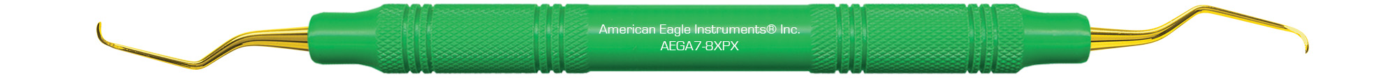 American Eagle Gracey Access 7-8 med guldfarvede ender og grønt plastgreb. OBS: Må ikke slibes. American Eagle Gracey Access er forlænget med 3 mm og med et kortere skær end en Gracey Standard, placeres nemt ved rodoverfladen og giver adgang til snævre parodontale lommer og furkationer. AEGA7-8XPX