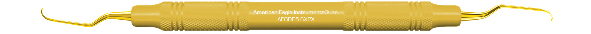 Gracey Deep Pocket 5-6 med guldfarvede ender og gult plastgreb. OBS: Må ikke slibes. DP er forlænget med 3 mm for adgang til dybe parodontale lommer på 5 mm eller dybere samt rodoverflader. AEGDP5-6XPX