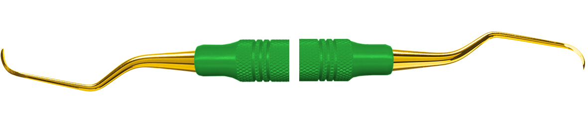 Gracey Deep Pocket 7-8 med guldfarvede ender og grønt plastgreb. OBS: Må ikke slibes. DP er forlænget med 3 mm for adgang til dybe parodontale lommer på 5 mm eller dybere samt rodoverflader. AEGDP7-8XPX
