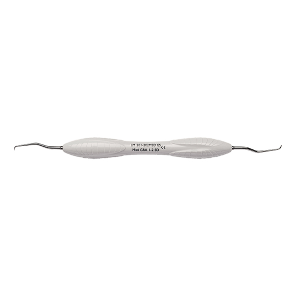 Curette, Mini Gracey 1/2, med længere hals og mindre arbejdende del end Standard, til fortænder og prræmolarer, SD Sharp Diamond, med coatede ender der ikke skal slibes, lysegrå, ErgoSense silikonegreb.