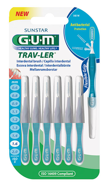 Interdentalbørster med plasthætter, der kan benyttes til skaftforlængelse og fleksibel hals, nr. 1614, blå, 0,7 mm tråd, 14 x 3,4/6,4 mm, kegleformet, ISO 5: PHD (Passage Hole Diameter) 1,6 mm