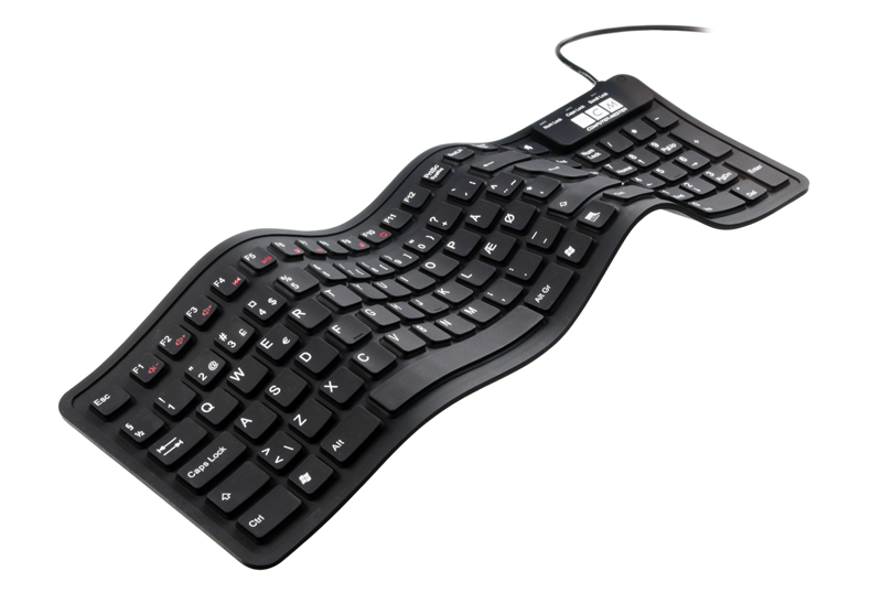 Holdbar og vandtæt tastatur i sort silikonegummi som er lydløs at skrive på. Støvtæt. Kan rulles helt sammen. 402x130x5 mm med numerisk del. 200 gram