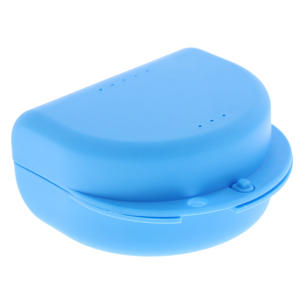 Plastæsker/opbevaringsæsker til bideskinner eller proteser, blå, model Ortho, størrelse 8 x 8 cm, højde 4,3 cm. perforeret.